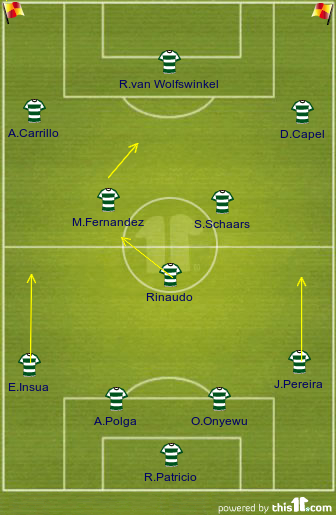 Tak z kolei wygląda najczęściej stosowane przez trenera ustawienie Sportingu Lizbona. W chwili obecnej kontuzjowani są Rinaudo i M.Fernandez. Gdyby nie mogli zagrać w spotkaniu z Legią mogą ich zastąpić kolejno: Andre Santos bądź Daniel Carrico na pozycji defensywnego pomocnika, a Matiasa Fernandeza wracający po kontuzji Marat Izmailov lub próbowany w meczu z Maritimo (Puchar Portugalii) Andre Martins. Zwraca uwagę ofensywne usposobienie bocznych obrońców, którzy bardzo często włączają się do ataku, ale równie często przy tym zapominają wrócić do obrony (szczególnie Insua, ale jego zmiennik Evaldo również). Dużo zależy również od skrzydłowych (Capel, Carrillo), którzy nieustannie wywierają presję na obrońcach drużyny przeciwnej. Zamęt w środku pola sieje Rinaudo, którego zadaniem jest rozbijanie ataków przeciwnika i natychmiastowe oddanie piłki środkowym pomocnikom: Schaarsowi lub Matiasowi. Szczególnie ten drugi (o ile będzie zdrowy i zagra) może sprawiać graczom Legii największe problemy. Ivica Vrdoljak i Ariel Borysiuk będą musieli zwrócić uwagę szczególnie na tego zawodnika, a środkowi obrońcy na Rickiego van Wolfswinkela, który uwielbia strzelać bramki z każdej pozycji, szczególnie głową. Niezwykle ciekawie zapowiadają się pojedynki Diego Capela z Kubą Wawrzyniakiem, z których zwycięsko powinien wychodzić młody Hiszpan.